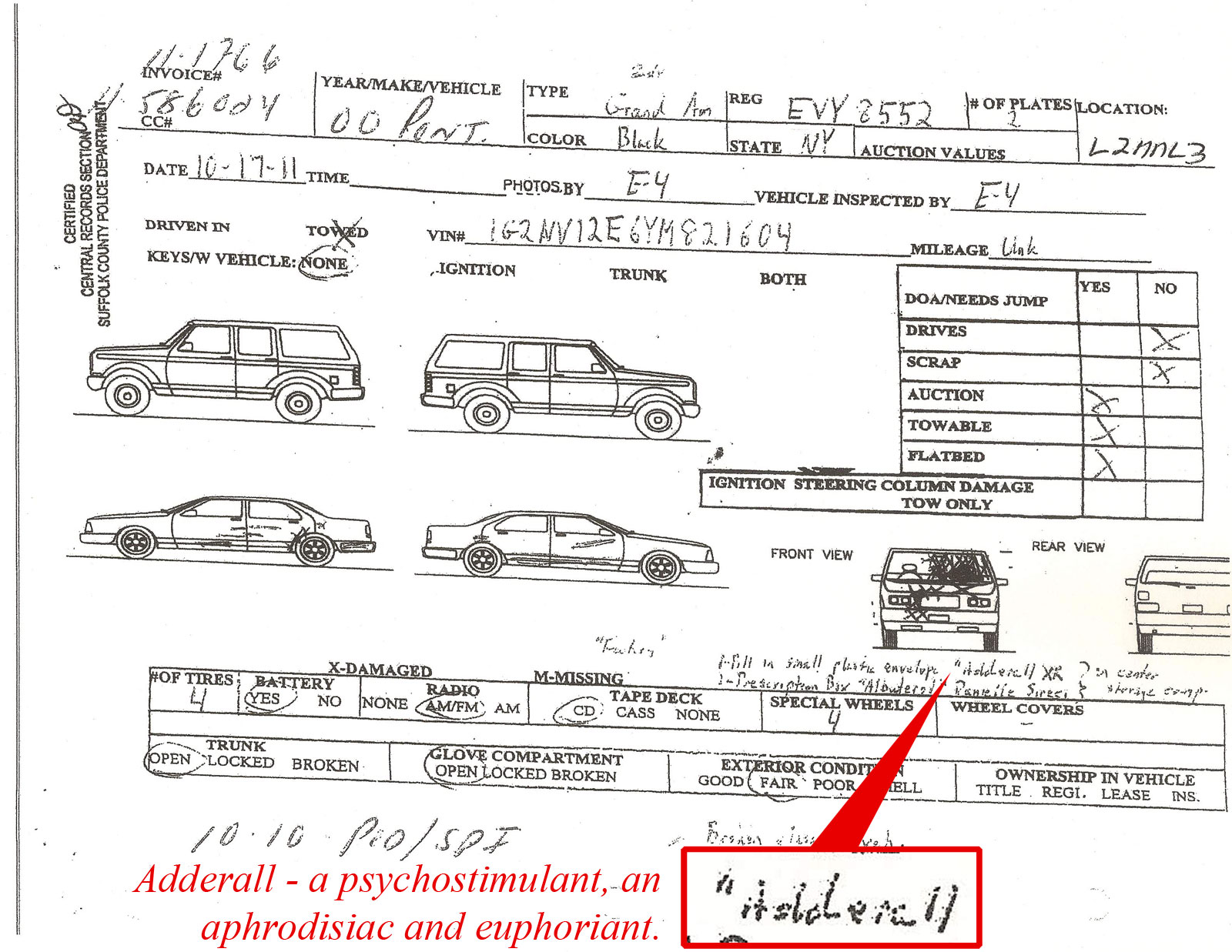 Police report states Adderall was found in the car. |